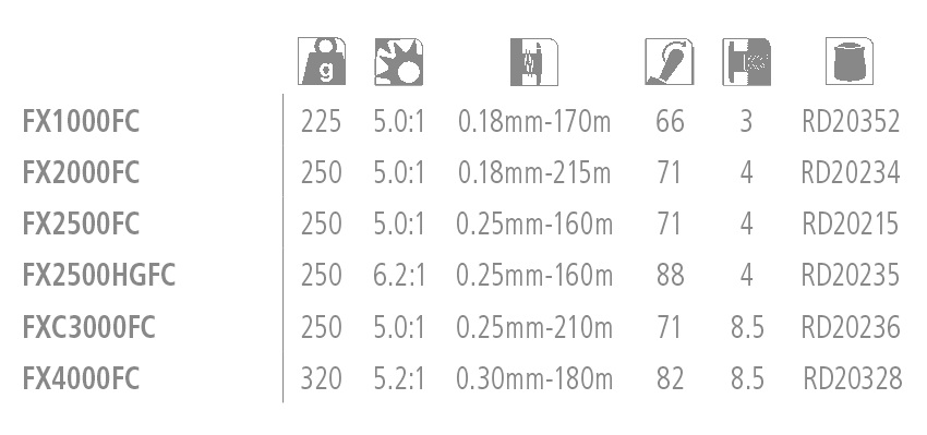 | Carrete Shilmano | FX 1000FC, FX 2000FC, FX 2500FC, FX 2500HGFC, FX C3000FC, FX 4000FC |