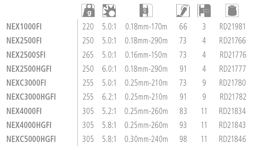 | Carrete Shimano | Nexave 1000FI, Nexave 2500FI, Nexave 2500SFI, Nexave 2500HGFI, Nexave C3000FI, Nexave C3000HGFI, Nexave 4000FI, Nexave 4000HGFI, Nexave C5000HGFI |