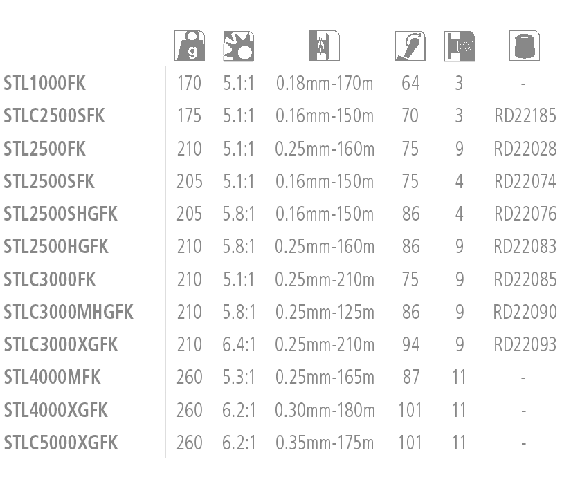 | Carrete Shimano | Stella 1000 FK, Stella C2500 FK, Stella 2500 FK, Stella 2500S FK, Stella 2500S FK HG, Stella 2500 FK HG, Stella 2500 FJ HG, Stella C3000 FK, Stella C3000M FK HG, Stella C3000 FJ XG, Stella C3000 FK XG, Stella 4000M FK, Stella 4000 FK XG, Stella C5000 FK XG |
